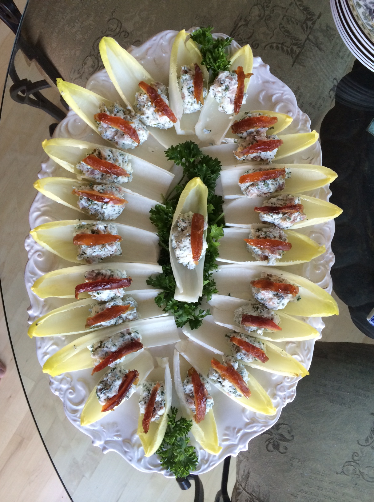 - Appetizer of Belgian endive spears stuffed with herbed goat cheese, prosciutto and medjool dates.